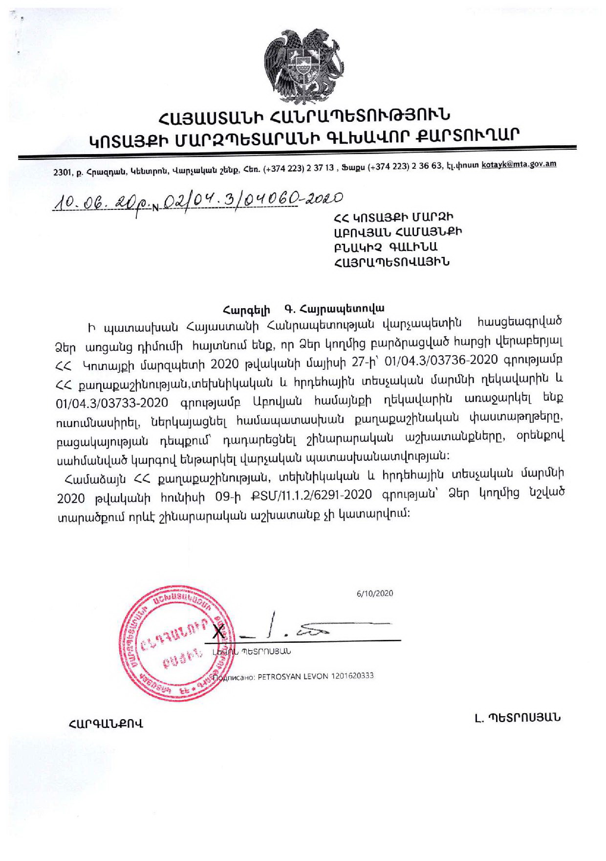 1. 8 июля, этого года, мы разговаривали, с администрацией города Абовян, где нам сообщили, что в отделе по Градостроительству проблемы. Там сотрудники заразились COVID-19, мол, подождите,…Что ж желаем всем здоровья, хотя некоторые сотрудники, были уже у нас, по заявлению от премьер - министра Армении Никола Пашинина, откуда письмо было послано и перенаправлено в обладминистрацию, затем в Абовян. (А сам премьер и наш коллега, лично, в курсе, что творится у нас? У дома его коллеги и известной журналистки? Что это случайность или? И почему, к примеру, никто не посмеет творить такое скажем у дома директора «ТВ КОТАЙК А». Карапетян, а у нашего окна можно, а? Мы писали и лично, также журналисту А. Акопян) Что это за наглость простите такая? Но….И откуда был дан ответ, что работы на захваченном участке у моего окна, не ведутся, тогда что велось и сейчас ведется и кто дал им такое право? Или мы все слепые? А они вчера явились вновь, притащили мешки с.. .Чем? Строили там что -то поставили новый какой- то кусок шифера уже за сеткой, камни… что б совсем мне не оставить места и воздуха, а? К месту спросить, стройматериалы, рабочие,… откуда, частные? А захват участка начался в дни комендантского часа в Армении. Работали без масок и перчаток, как и всегда и теперь! Откуда, на пенсию матери? Ведь не секрет, что все эти стройматериалы - сетка, ворота… стоят недёшево. И они совсем не новые - а ржавые, грязные и…. В нашем акаунте Гугл имеются все фото с начало работ и по сей день, с датой и временем съемок. Тем более по международной конвенции по правам инвалидов, и в целом и в частности, по правам человека, которую подписала и Армения… Запрещены всякого рода постройки, площадки, мероприятия в близь жилых окон зданий, спальных комнат и далее… Мне человеку с ограниченными возможностями, должен быть дан свободный проезд, проход на кресле -коляске и тому, кто мне помогает,… А это что тогда и для чего, а главное для кого, если никто кроме этой семейки туда не заходит, а ключи у них, так для кого для всех или только для Данелянов, они что купили, арендовали эту землю? Однако, в секретариате мэра нас уверили, что ответ будет, и что они также лично передадут Геворкяну и уведомят его о нашем звонке! А также передадут мои данные Т. Казарину, у кого и находится все наши 3 последующие заявление, письмо-мое первое лично меру, от аж 26 мая 2020, и от моего адвоката. Написанного чуть позже. Астхик Казарян, которая также звонила им,… Кстати, мы сами позвонили Тиграну Казарину, но трубку никто не снял,… Хотя секретарь сказала, что они на месте…Он сам пока не звонил. Хотя если честно, они все там уже во всем в курсе (?). И звонить надо нарушителям-соседям, и кто в этом замешан по ул. Дарани, д. 8, с 5 этажа здания, а не нам, так что… И мы желаем здоровья ребятам из этого отдела, тем более знаем, что это такое,… ибо также, кто защитит мое итак подорванное здоровье? И мы сами находимся в гр. Риска. Карен Григорян, Артур Хачатрян… вы были у меня и все видели, сказали работы не ведутся, их предупредят, но к сожалению… Уже 3 месяца. И ситуация усугубилась: ведутся, приходят и трепят мне и всем нам нервы... Примите меры! Есть закон, который нарушен и многое чего… Ибо у нас тоже есть и права и обязанности и большие... Мы пока не знаем, кто во всем этом замешен, но, наверное, в скором времени все выяснится,но мы также, с пониманием отнеслис