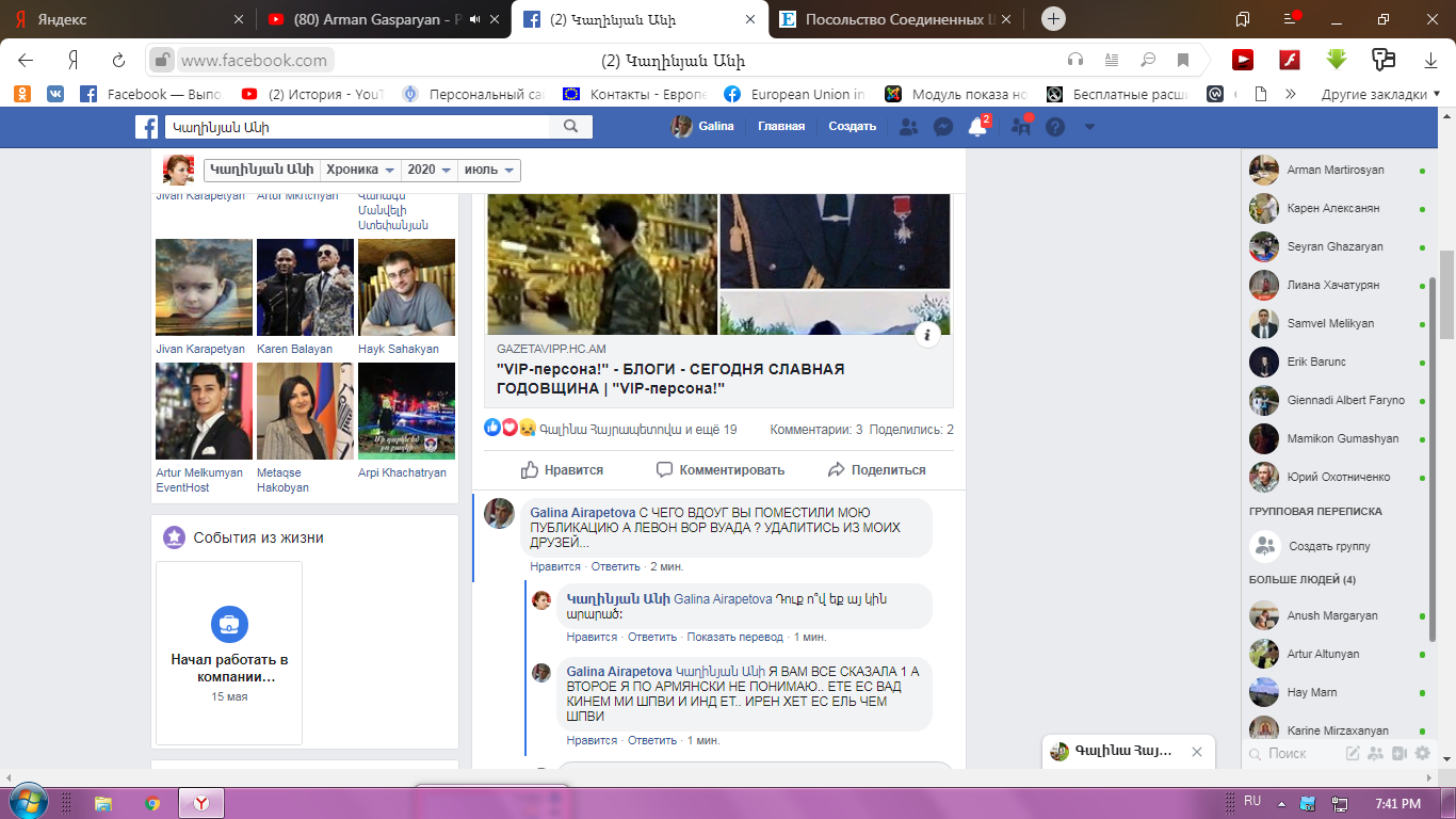 2.По нашему делу с захватом территории, прямо у моего окна. Кажись, что- то сдвинулось… через адвоката. А мы направили жалобы и в суд, и правозащитнику и в областную администрацию. Вчера аказмыш, к нам сам архитектор и начальник отдела градостроительства города Абовян, Тигран Казарян, приходил, все выяснять и разбираться…Что ж хорошо и мы рады…Что, наконец, отреагировали и с нами пришели поговорить, но нас не было дома... очень жаль,… а нам не позвонили и не предупредили о их визите к нам! Ну, ничего, может еще встретимся. Сегодня пришли другие сотрудники, постучали в окошко ко мне... Я показала все, рассказала... Но как они сами ответили, итак все ясно… и понятно,… Что ж надеюсь,…Правда не представились. Но…сфотографировали, это злополучное место… Надеемся, будет нам дан официальный ответ и незаконное ржавое строение, из газовых труб и сетки… будет снесено или нами или самой мэрией, навсегда! И эти негодники, больше не будут нам всем трепать нервы,… И я больше не увижу их наглые лица у своего жилица,…Кстати, спасибо всем, всем-кто поддержал нас, в этом ужасающем беззаконии! Но надеемся, справедливость восторжествуем и мы еще назовем всех поименно! А пока только скажу: спасибо огромное моим родным и коллегам …в Арцахе, в Ереване… Ашот Джан спасибо… Арам Джан-мы с вами давно знакомы, Спасибо…в Абовяне… Ани Джан… Леаночка-соц службы и труда при Мэрии… Вов Джан - ЛАВ АРАЧАРК… Будет еще реклама у нас в газете хотите?Спасибо! Без вас всех я бы не справилась.