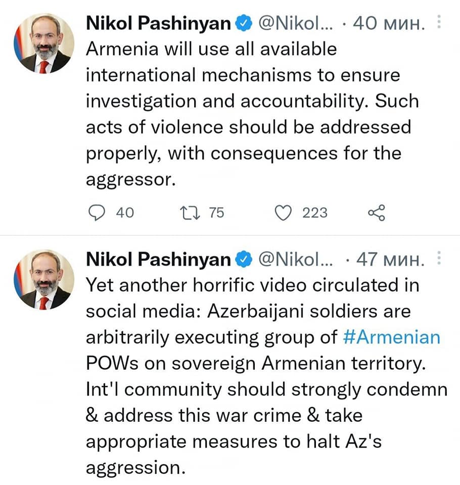 А мы просто не успеваем. Вчера написали это-сегодня вылезло это, распространяемая Бакинским сегментом. Н езнаем даже как прокомментировать. Макрон у себя выложил это, а мы написали ему комментарий вот этот: Возмутительно просто, тогда Франция не вправе быть страной сопредседателем, что будет с Карабахом господин "союзник" нашли себе да полусумасшедшего революционера, который даже свои границы защитить, не способен, а вы ему потакаете. Более того, вот единственное инфо которое Пашинян выложил в Твитере, а об остальном - все шито - крыто…Только писк секретаря МИД РА, о каких - то правах карбахцев! Хотя Давид Бабаян заявил о прежней формулировке, права народа на самоопределение и целостность территорий и суверенитета. Однако мы в преданность всех не верим - и знаем почему, минская группа отсутствует и пр. Кстати если исходить из СМС Макрона на Фейсбук, то с 1991 года НКР, до того момента не входила в состав АР и ни в каких декларациях не значится, а провела свой референдум по выходу из состава СССР. Тогда в чем вопрос и где логика и о какой такой своей территории говорит Алиев, И кто тогда будет защищать какие- то права наших граждан там? Но мы не сойдем со своего пути и будим бороться либо за независимость, либо в состав России, коль Россия правопреемница данного документа и конфликта, ибо Карабахский конфлик загорелся, аж 1988 году, до распада СССР, а вариант Косово для НК, возможно, сможет обсуждать ЕС, если пожелает.