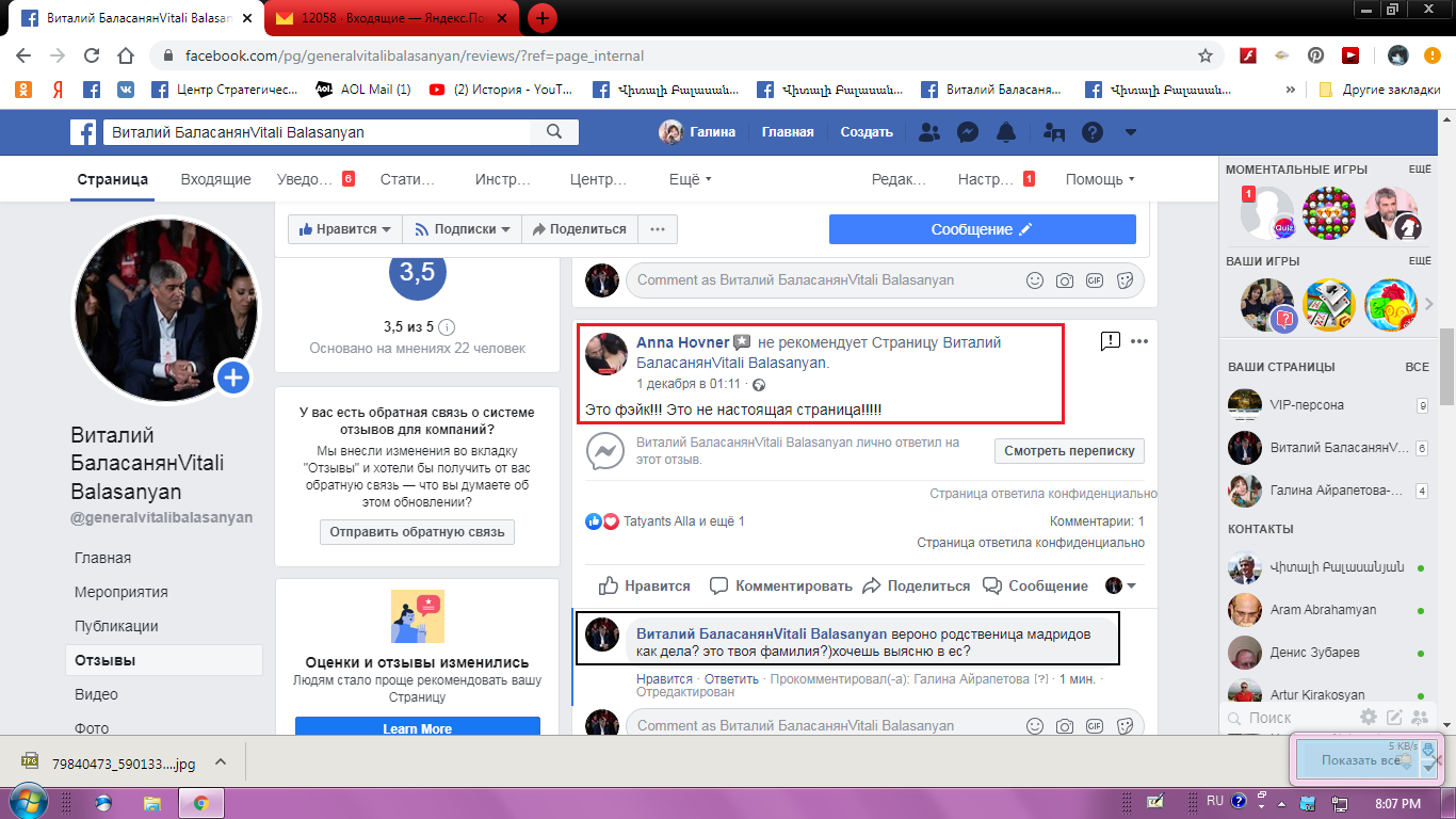 Обязательно посетите эту группу, теперь она одна у Баласаняна, моей нет...я только что удалила,не хочу сказать, брата, пусть он известный человек генерал, сам скажет кто я... ибо я тоже не лыком сшита и человек не без известный.. и уважают и любят меня и без него и у меня тоже есть самолюбие...А он любит,, как думаете или полит принципы важнее родных, но тогда надо было все объяснить и сказать-Галина ваша помощь мне не нужна не так?Без обид.. а не молчать и...Так вот удалила из друзей и грубо ответила и попрощалась с ним.. причина вот эта фифа и особа, после всего ее хамства ко мне... она сегодня со всех акаунтах просилась еще ко мне в друзья... цинница... я разозлилась и послала их обоих подальше от себя... Но скажите как человек и все там члены этой группы, будут голосовать на выборах в НКР, когда там одни простите рфсеровцы и люди не имеющие арм гражданства... многих я знаю, многие журналисты... кировабадские и пр... но с единым прошлым, мягко сказать...так вот как они не имеющие вообще ничего общего, даже по корням с НКР, будут голосовать на выборах,да еще и вести агитацию.. это чистый фейк и вмешательство в дела Карабаха, играя роль анти рекламы и...а там у них такой вопрос при вступлении в группу- вы готовы отдать свой голос за Баласаняна?Вот так вот. Я не знаю, что их связывает... да и уже знать не хочу... Захотят пусть сами всем расскажут.. лишь бы мое доброе имя и меня не трогали... но... это я еще короткий скрин сделала, не раскрыла текст... да и одно фото с ней и с ним вместе не выставила бог с ними... пусть живут и радуются...я никому видит бог зла не желала и в друзья не просилась...Баласанян кстати сам меня пригласил... так что... только вот распростилась я сама...Ну ладно не буду вас грузить, а то скажите плохая...на "брата" клевещу... одинокая и... пока друзья!Всего вам доброго!Просто есть такие дамки змеями называются.. пусть радуется и... обнимается...